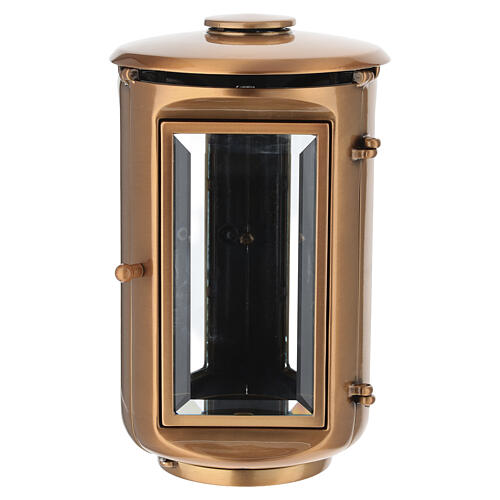 Diseñada para uso exterior en cementerios y realizada con acabado bronce y construcción compacta.