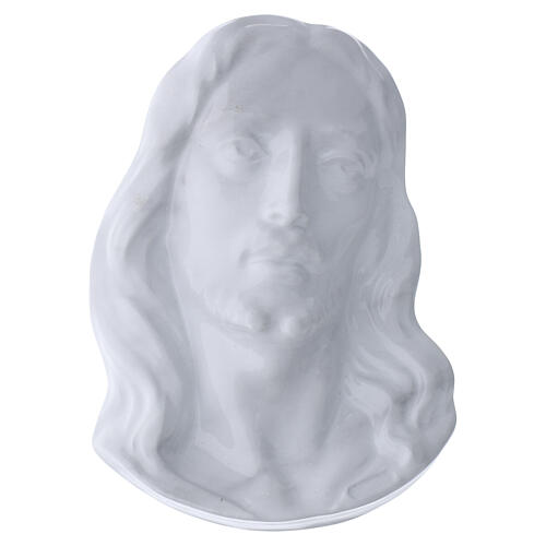 Placa aplicable de aleación metálica con desarrollo vertical, que representa el rostro de Cristo mediante modelado en bajorrelieve; superficie con efecto mármol Carrara y perfilada para su colocación sobre pared o soporte lapidario.