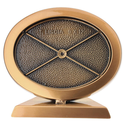 Marco funerario ovalado para fotocerámica de 9x12 cm con acabado bronceado y diseñado para colocación en suelo.