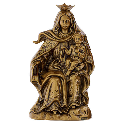 Placa funeraria para pared de 22,5 cm que representa a la Virgen del Carmen en trono, realizada con metal bronceado. Presenta una configuración escultórica pensada para contextos conmemorativos.