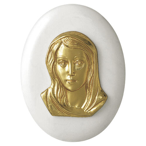 Placa rostro Virgen dorado sobre base blanca ovalada 17x13 cm para exterior