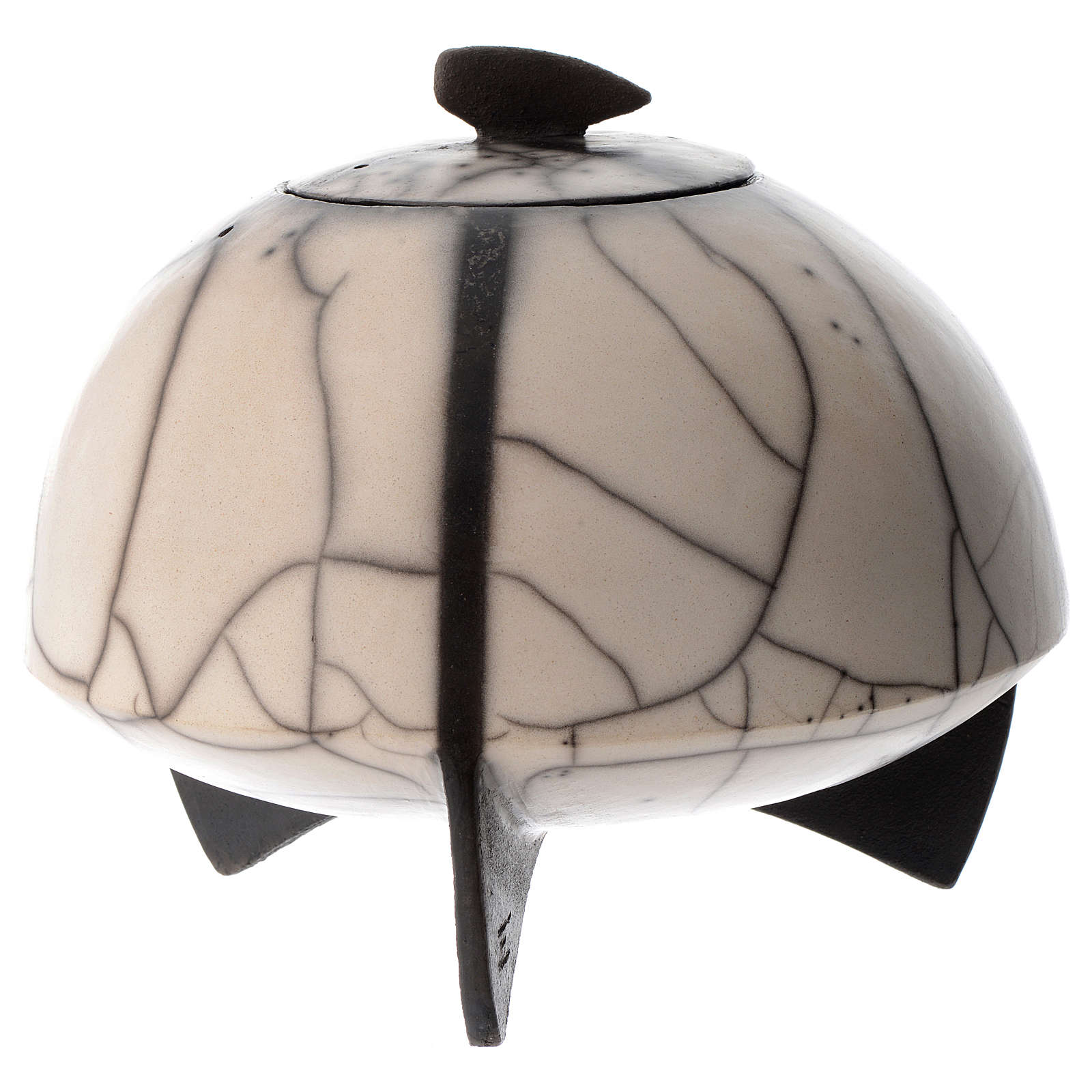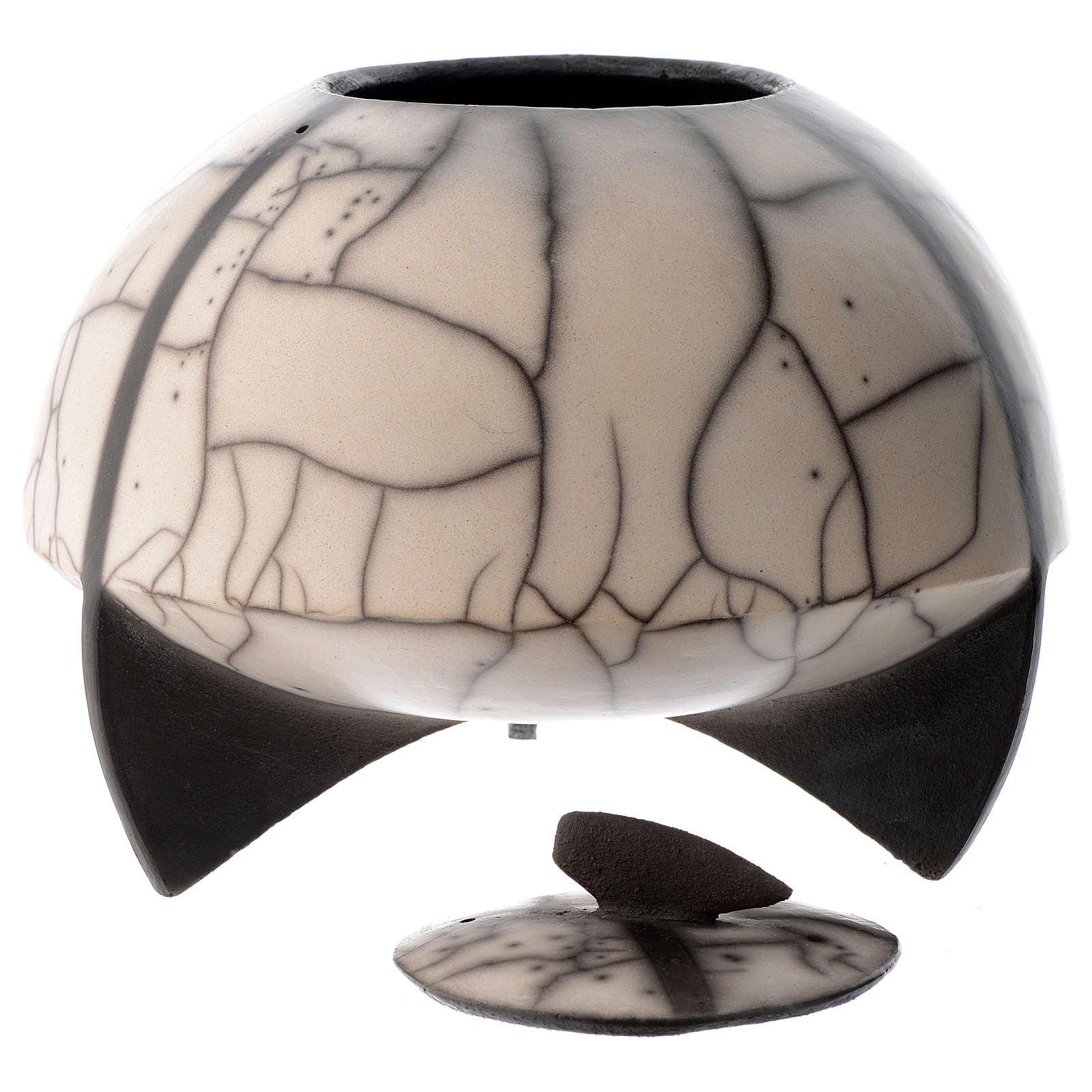 Urna cineraria completamente realizada a mano y es horneada con la técnica Japonés Raku (Naked Raku), enriquecido con una variante de la técnica Kintsugi utilizando resinas de dos componentes.