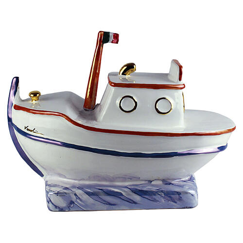 Urna cineraria en forma de barco de cerámica esmaltada y decorada con colores cerámicos y detalles dorados. Diseñada como pieza funeraria con un acabado decorativo elegante que remarca su forma estilizada y compacta.