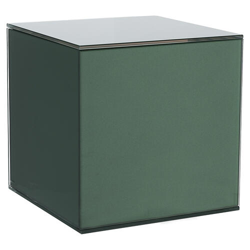 Diseñada para la conservación de las cenizas, fabricada en vidrio con acabado verde y presenta una forma cúbica de líneas rectas, perfil regular y superficie lisa y uniforme, sin decoración aplicada.