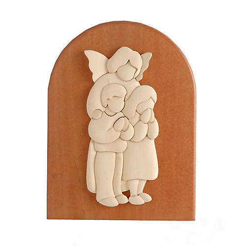 El bajorrelieve reproduce el ángel de la guarda mientras acompaña dos niños con las manos unidas. Es muy simple, pero al mismo tiempo intenso. La obra es hecha a mano por los jóvenes focolarinos de Loppiano, en un ambiente de espiritualidad y trabajo cristiano.