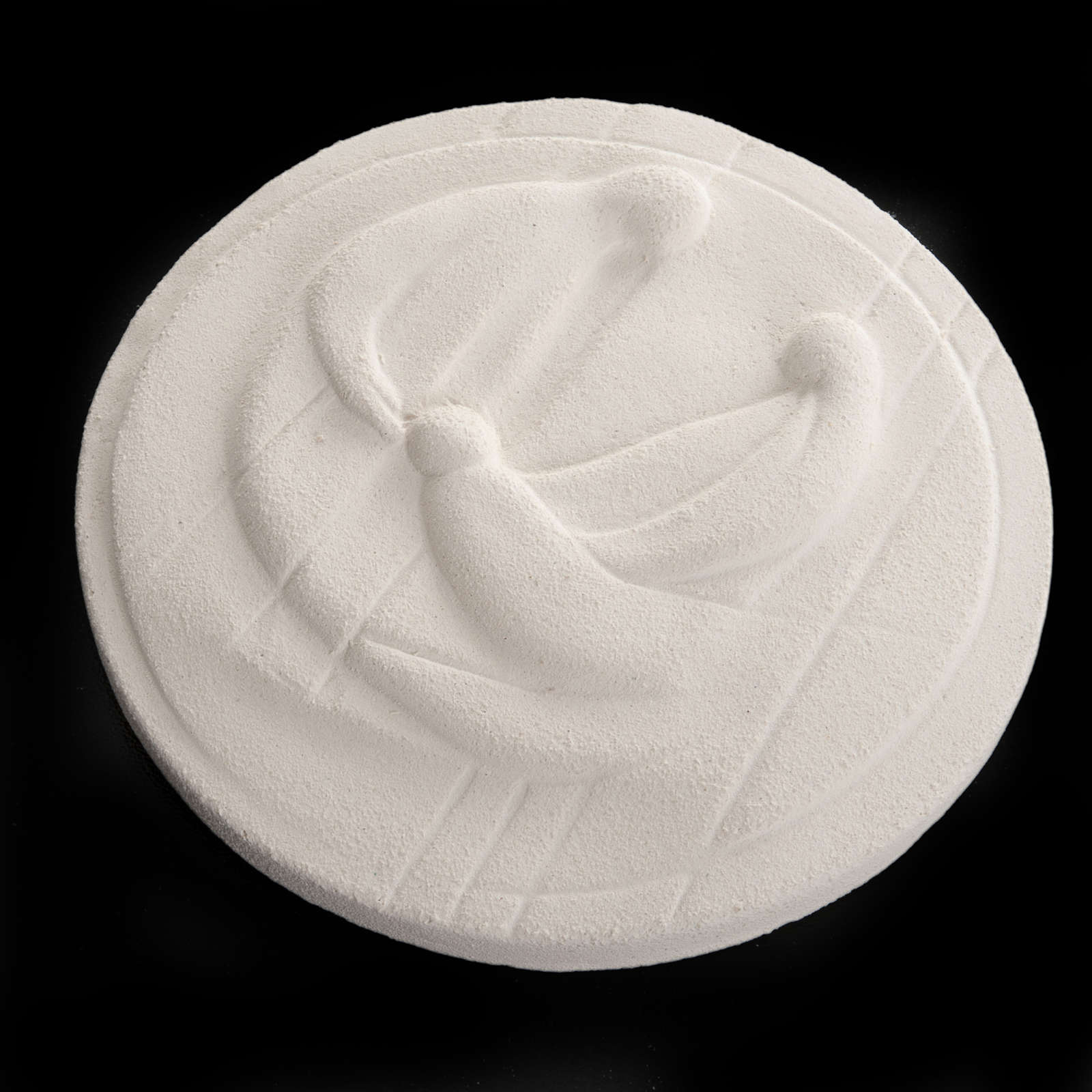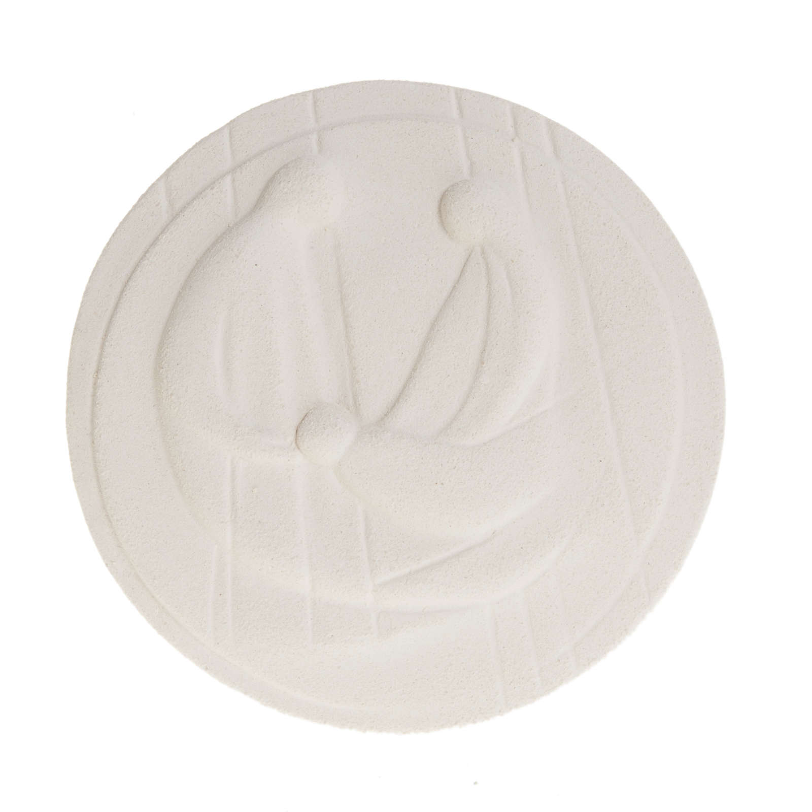 Arcilla refractaria en forma circular con la imagen de la Natividad.