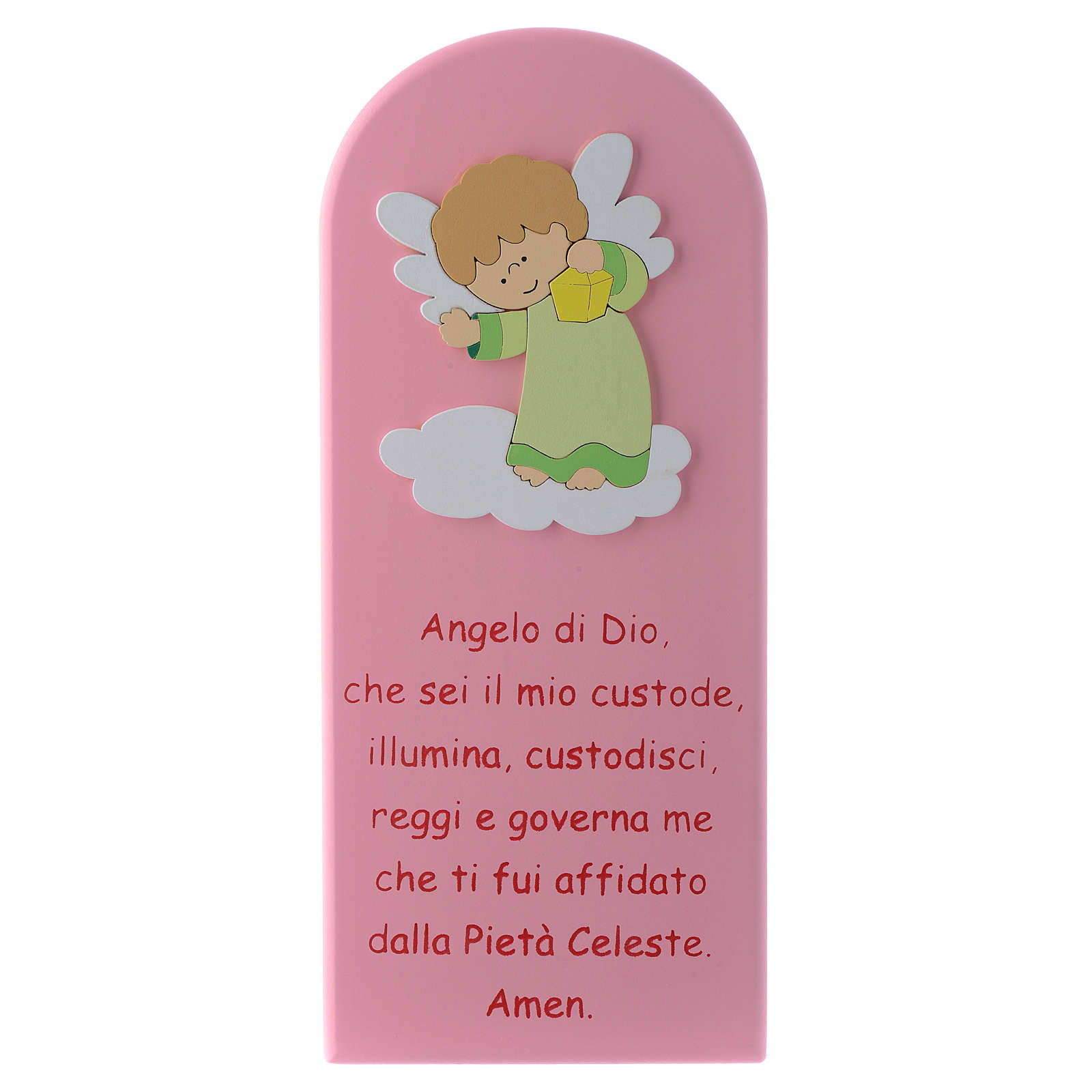 Retablo Ángel de Dios con Ángel verde y oración de 30x10 cm de madera rosa ideal para decorar la pared de las habitaciónes de los niños o como regalo para bautizos, cumpleaños y otras ocasiones especiales.