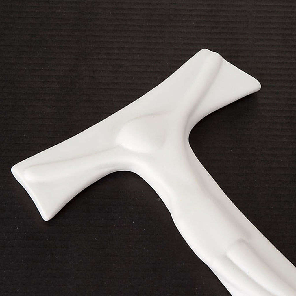 Crucifijo de porcelana blanca di Francesco Pinton con la cruz Tau, sobria y refinada. Apreciable por el estilo esencial y moderno.
