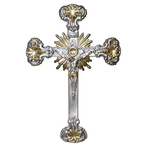 Cruz de pared de 45x30 cm de latón de estilo barroco con corona de rayos que enmarca la paloma del Espíritu Santo y cuerpo de Cristo aplicado frontalmente.