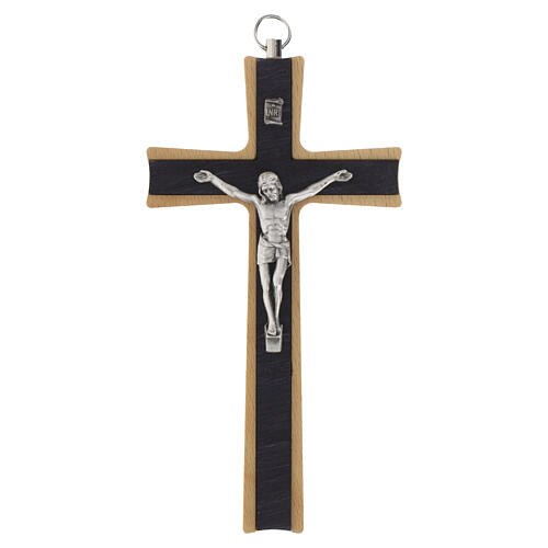 Crucifijo compacto de pared en haya clara con inserto central oscuro y cuerpo de metal plateado. Altura 15 cm.