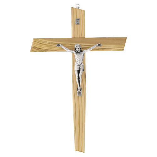 Crucifijo de 35 cm de altura de madera de olivo italiana con figura central de metal plateado fundido.