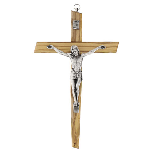 Crucifijo de pared de 25 cm de altura con cuerpo de aleación plateada y soporte torneado a mano de madera de olivo.