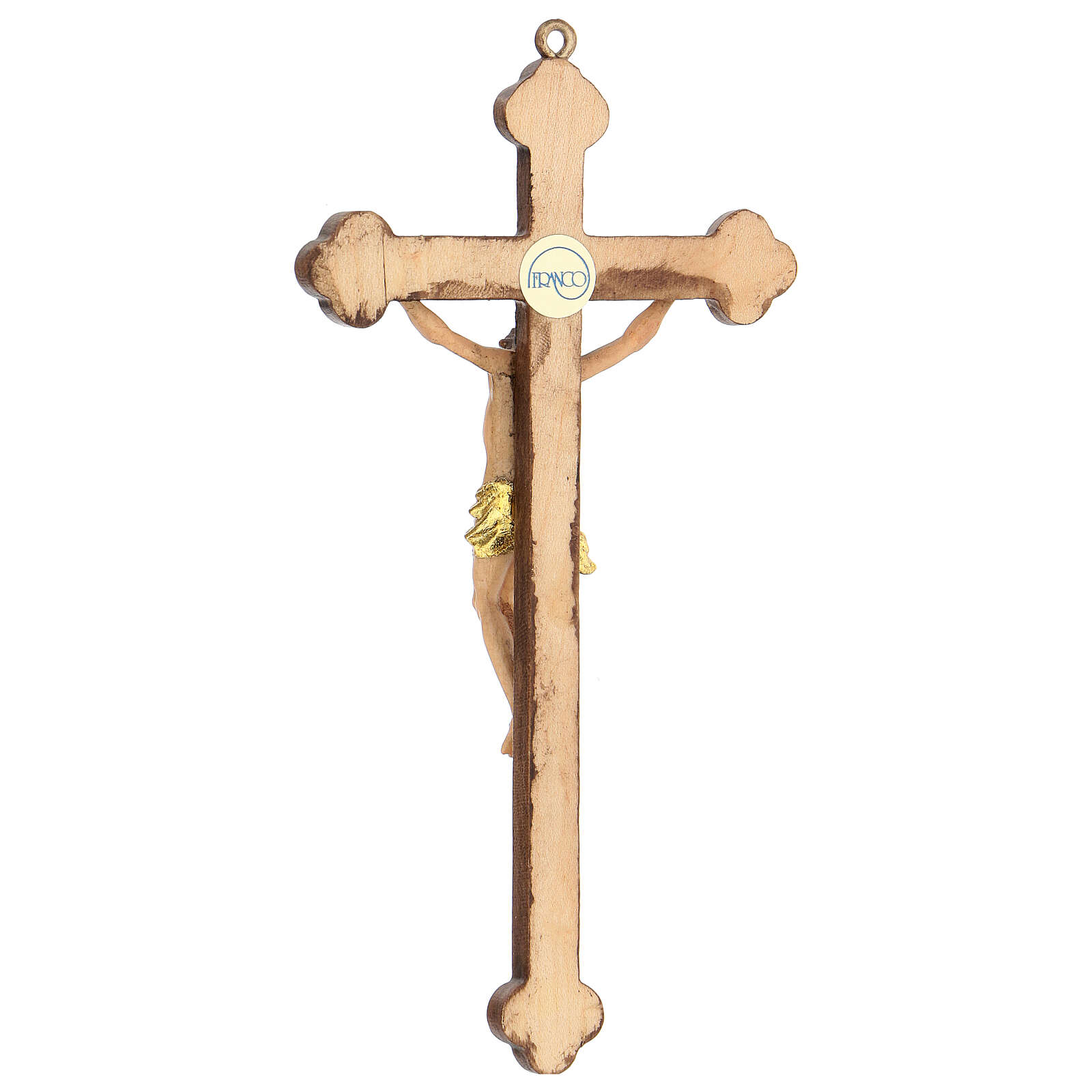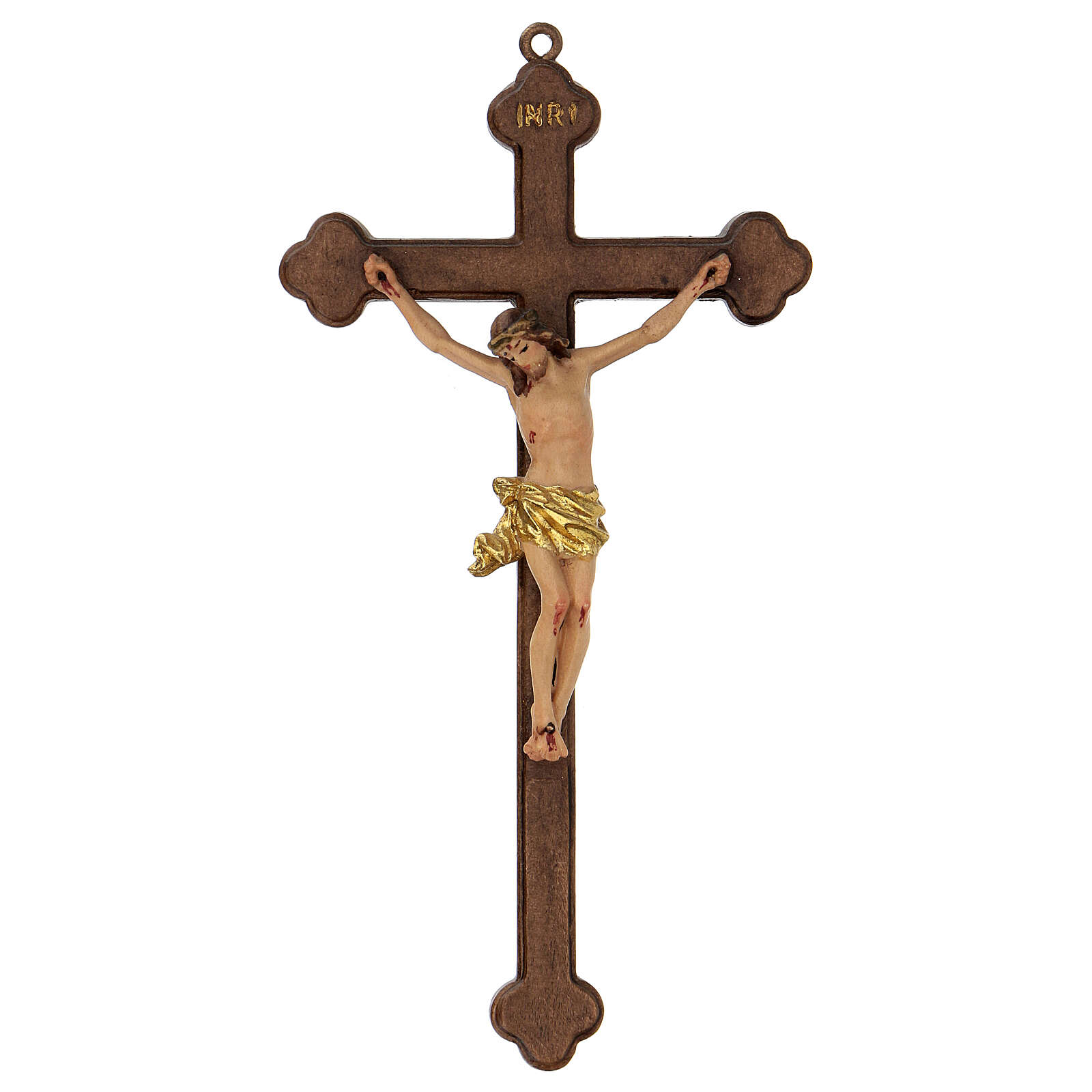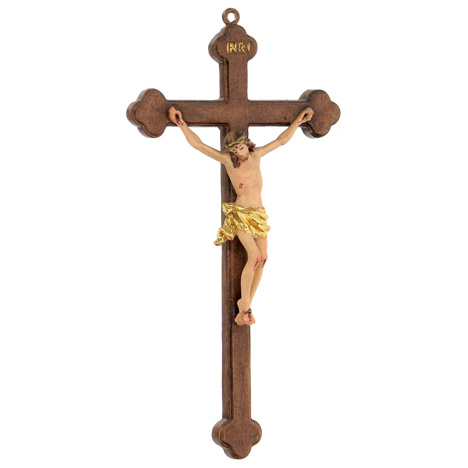 Un pequeño crucifijo pintado a mano, con los brazos de la cruz a trébol.