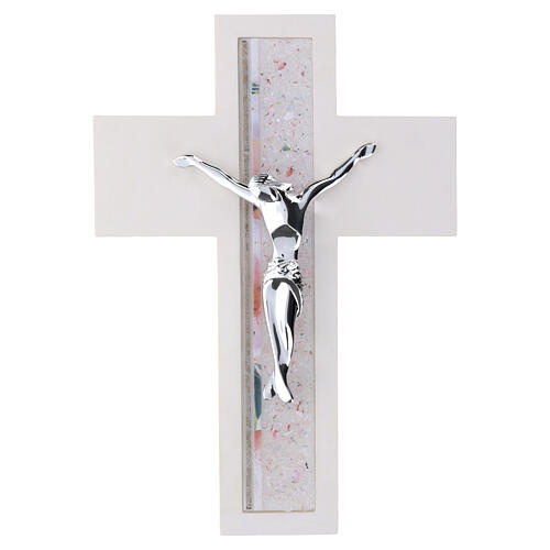 Cruz de pared de resina blanca con efecto madera lisa y perfiles cuadrados, enriquecida con una franja central de vidrio de Murano en tonos claros y la figura de Cristo de metal cromado.