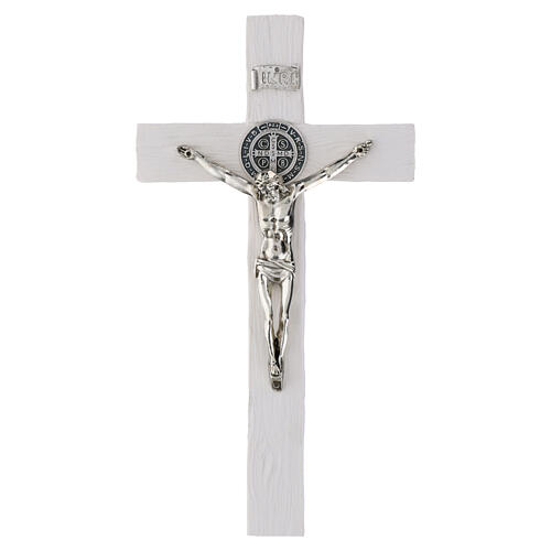 Cruz de resina San Benito blanco detalles plateados 21x10 cm