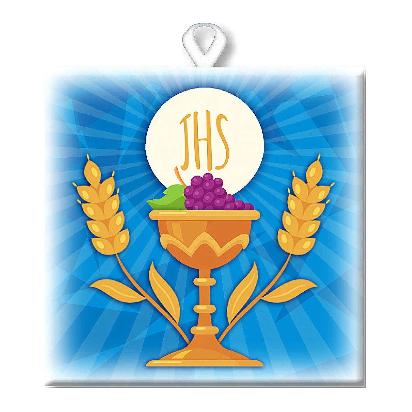 Baldosa de cerámica de 10x10 cm con imagen de los Símbolos Eucarísticos impresa en los laboratorios de la empresa Fratelli Bonella de Sassuolo, una ciudad del Italia del norte.