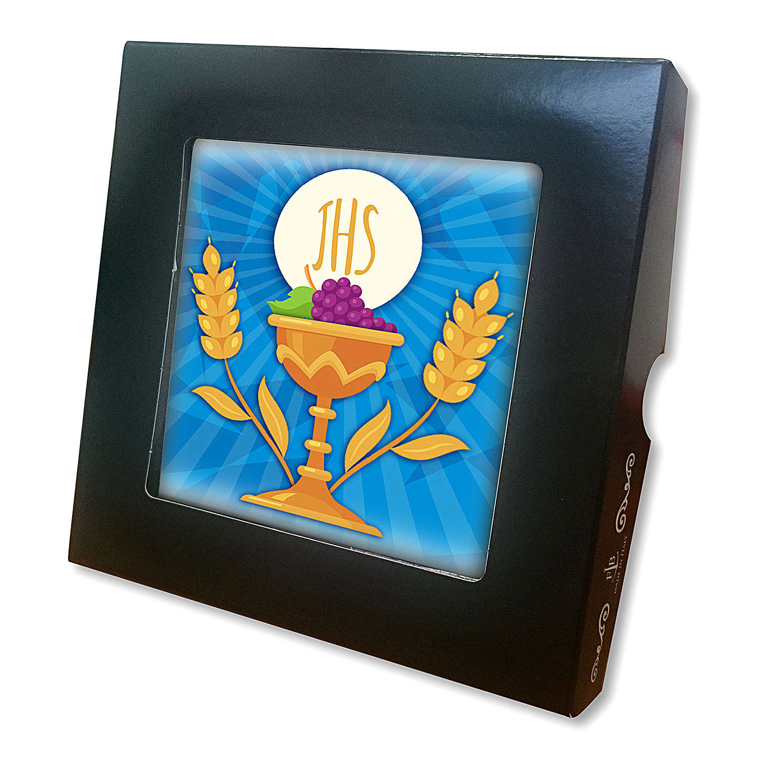Baldosa con colores vivos y caja elegante ideal como recuerdo o bombonera de la Primera Comunión.
