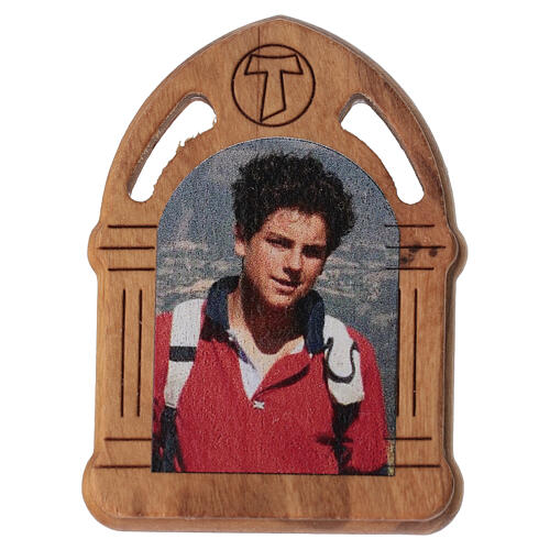 Cuadro en forma de arco de 5,5x4 cm de madera de olivo de Asís con Carlo Acutis.