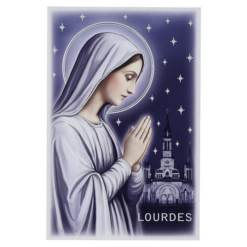 Cuadrito Valenti vertical de 18x12 cm con la imagen de la Virgen de Lourdes.