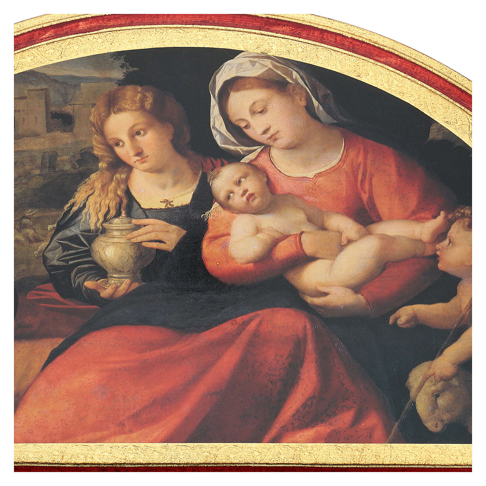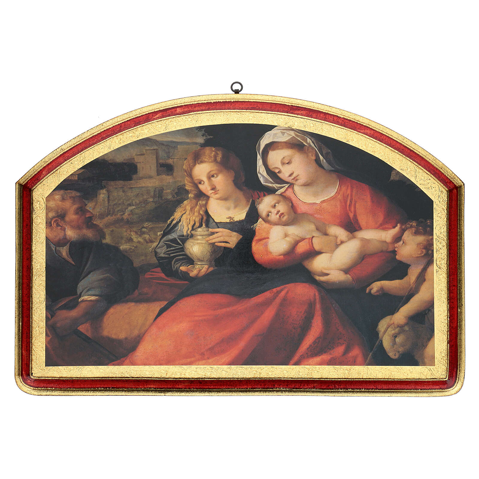 Cuadro de 40x60 cm de madera con la Sagrada Familia y San Juanito de Jacopo Negretti.
