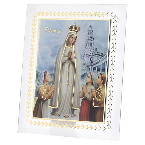 Cuadro sacro Valenti de 20x18 cm con la imagen de la Virgen de Fátima impresa en alta definición sobre soporte de vidrio y base de madera de 21x17 cm.