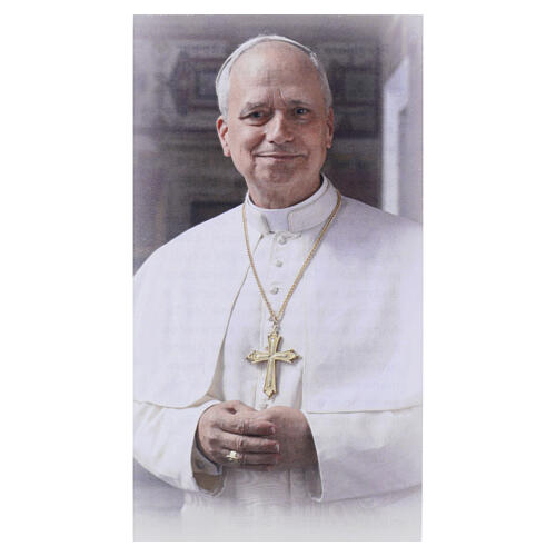 Estampa devocional de 10 x 5 cmdel Papa León XIV en sotana blanca.
