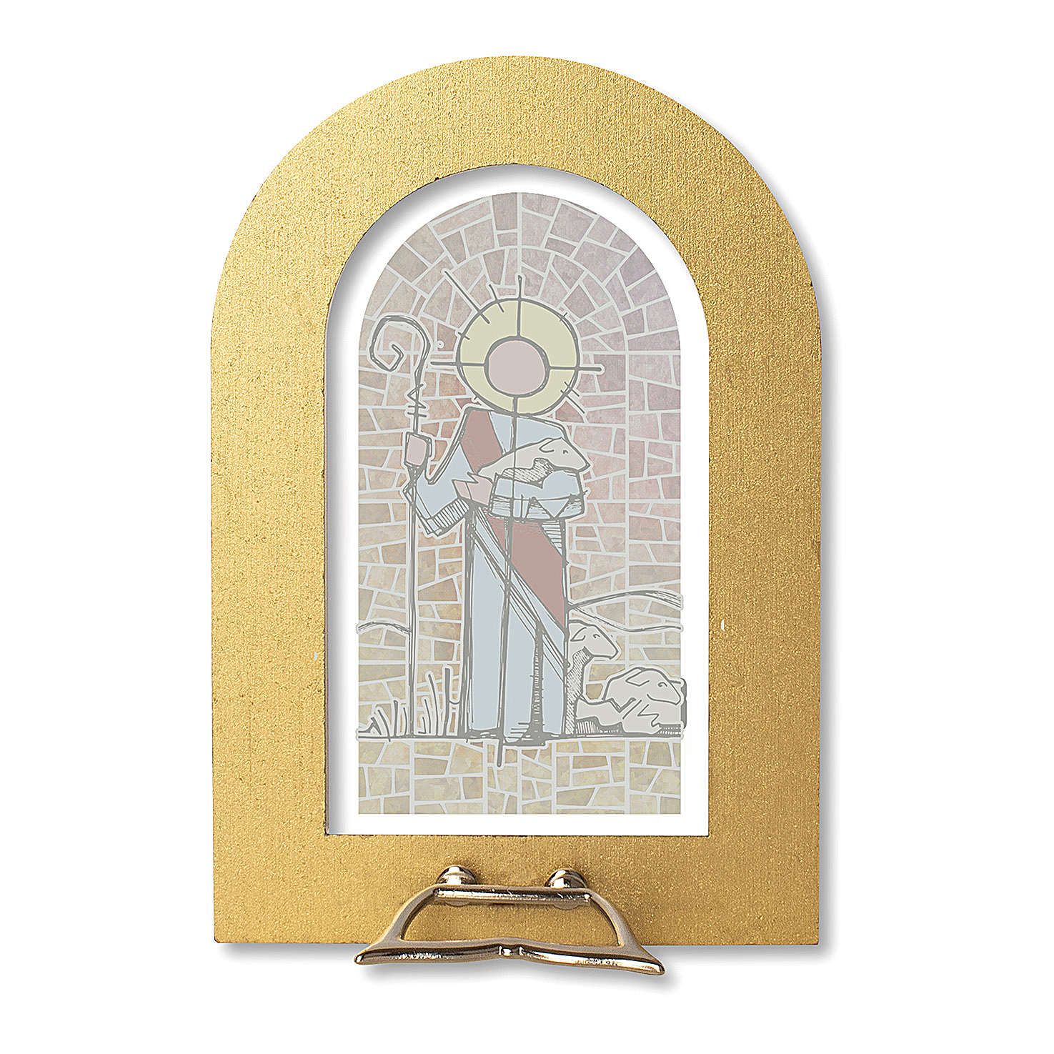 Marco de madera dorada de 14x8,5 cm con vidriera semi transparente con Jesús Buen Pastor en estilo contemporáneo.