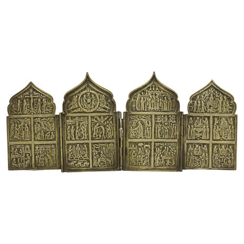 Ejemplar extraordinario de icono de viaje ruso: este políptico de bronce con esmaltes contiene un amplio ciclo iconográfico dividido en cuatro tablas, pensado para acompañar al fiel en la oración cotidiana incluso lejos de los lugares de culto.