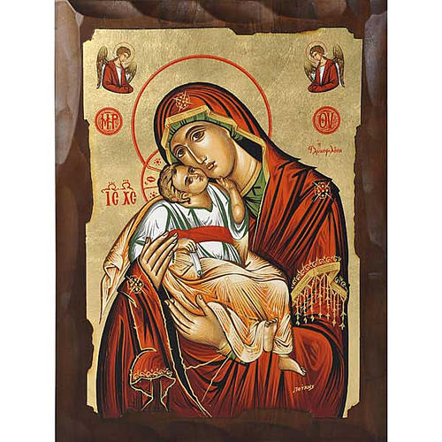 El ícono de la Virgen Glicofilusa (la dulce amante) nace a mediados del siglo XIV. La imagen manifiesta una intensidad expresiva muy profunda. La Madre y el hijo están abrazados tiernamente, la mejilla de la Madre se inclina sobre el Hijo y con la mano le acaricia el mentón. El niño Jesús sostiene en mano un papiro símbolo de la Palabra de Dios. Serigrafía aplicada y acabada a mano sobre tabla de madera preparada y lámina dorada.