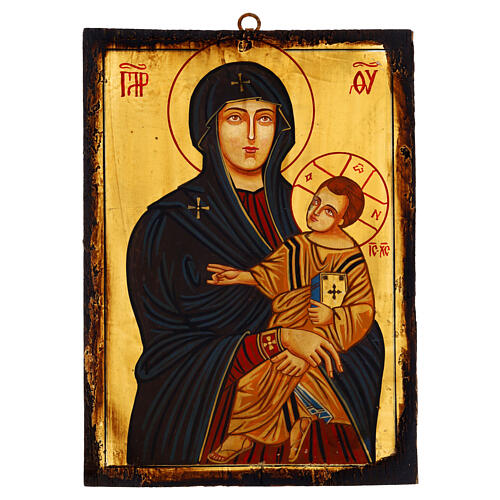 Este icono representa a la Virgen Salus Populi Romani, uno de los títulos marianos más sentidos y venerados en la tradición cristiana. María está representada con una expresión dulce y tranquilizadora mientras lleva en sus brazos al Niño Jesús, quien sostiene un evangeliario y con la mano derecha bendice al pueblo. Icono pintado sobre una tabla antigua siguiendo la escuela iconográfica bizantina, con trazos clásicos y gran atención a...