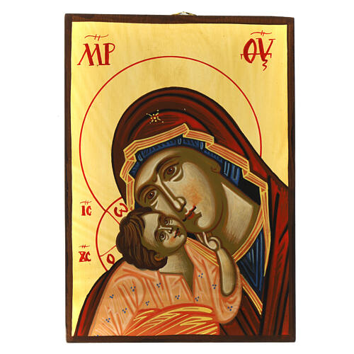 Icono rumano de la Madre de Dios Jaroslavskaja de 21x15 cm, pintado a mano sobre una tabla de madera maciza con fondo dorado.