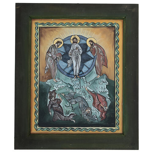 Icono Transfiguración azul pintado a mano en óleo sobre vidrio Rumanía 40x30 cm