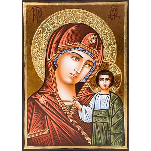 Ícono inspirado en la Virgen de Kazan, pintado a mano, con lámina de oro sobre una gruesa tabla de madera.