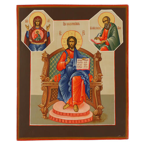 Este icono de origen ruso representa a Cristo Pantocrátor, figura central de la tradición ortodoxa: Cristo, sentado frontalmente en un trono, realiza el gesto de bendición con la mano derecha y sostiene el Evangelio abierto en la izquierda. El halo que rodea su cabeza está decorado con las letras griegas que significan «El que es», símbolo de su divinidad.