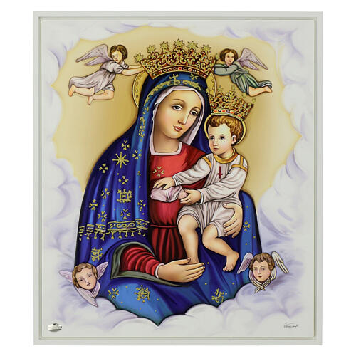 Cuadro sobre madera blanca que representa a la Virgen de las Gracias con el Niño, en acto de buscar el pecho. La imagen, impresa en alta calidad, está enriquecida con relieves y decoraciones de purpurina dorada aplicadas a mano.