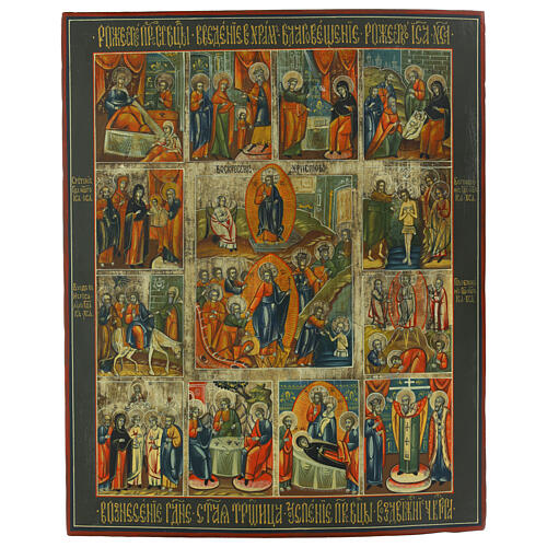 Icono ruso de las 12 fiestas en tabla antigua de 52x42 cm. Representa los principales momentos celebrados por la fe de la Iglesia Ortodoxa.