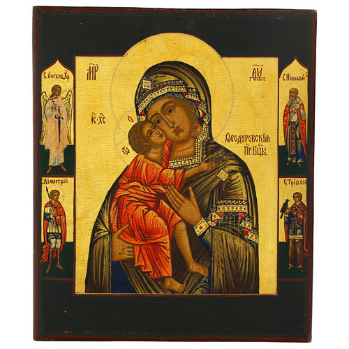 Icono ruso moderno sobre tabla antigua de 31x26 cm que representa a la Virgen Feodorovskaya con Santos sobre fondo verde.