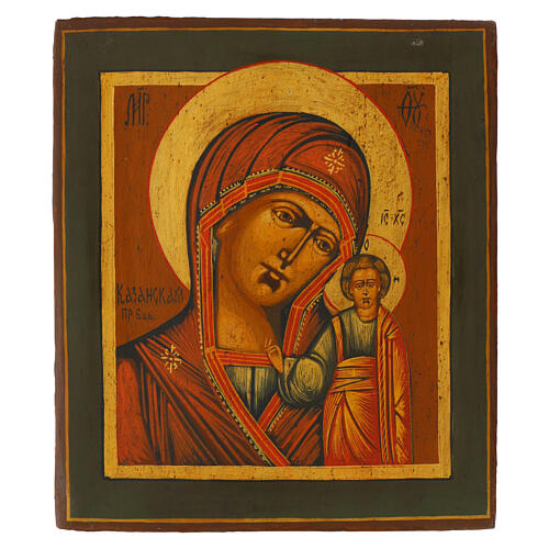 Icono ruso antiguo de la Virgen de Kazan sobre tabla de 31x27 cm pintada a mano y restaurada.