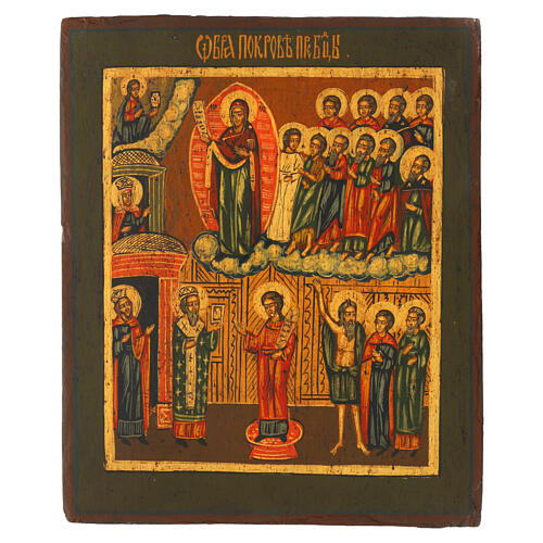 Pokrov Protección de la Madre de Dios icono ruso restaurado sobre tabla antigua 35x28 cm