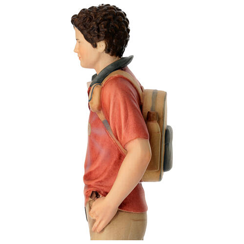 Estatua de Carlo Acutis de madera de la Val Gardena con vestidos sencillos y juvenil representando humildad y ternura.