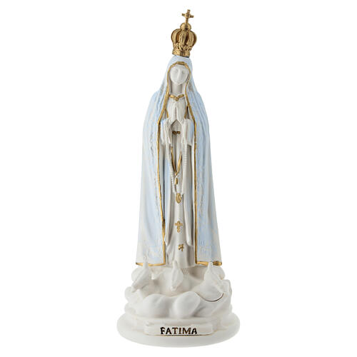 Escultura de resina que representa a la Virgen de Fátima en actitud orante, con corona dorada y capa azul decorada, colocada sobre una base modelada en forma de nube con palomas.