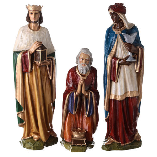Estatuas de los Reyes con tratamiento de barniz resistente a la intemperie, lo que hace que este producto sea ideal para componer un belén al aire libre.