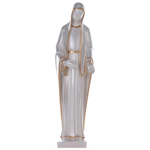 Estatua de la Virgen Milagrosa de polvo de mármol nacarado con motivos dorados.