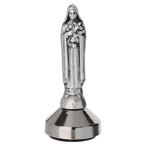 Estatua de zamak plateado que representa a Santa Rita con crucifijo y libro en las manos, montada sobre base magnética de metal torneado.