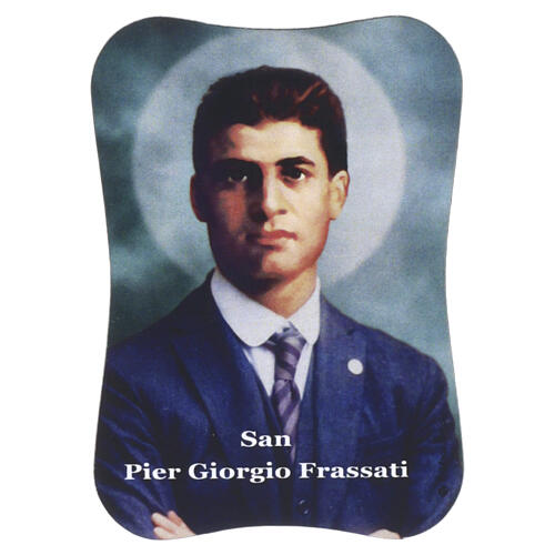 Imán de devoción de madera recortada de 5 cm con imagen de colores de San Pier Giorgio Frassati en el anverso.