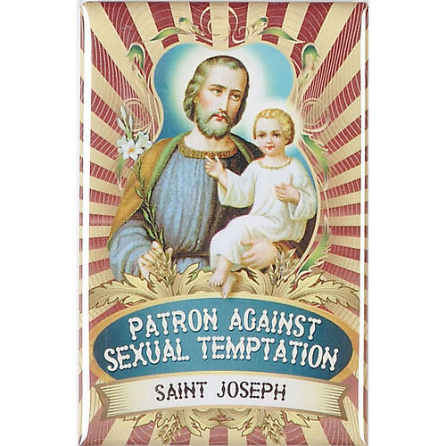 Imán decorativo en inglés con imagen de Santa José invocado contra las tentaciones carnales.