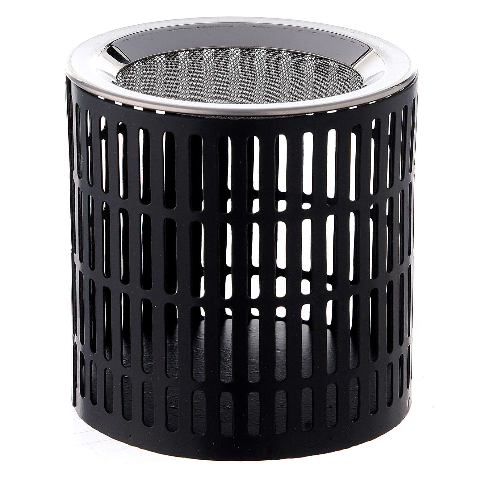Pebetero de hierro negro opaco de 8 cm de altura.Pebetero perforado con rayas verticales, base para la vela y sartén pequeño arriba para el carboncillo.