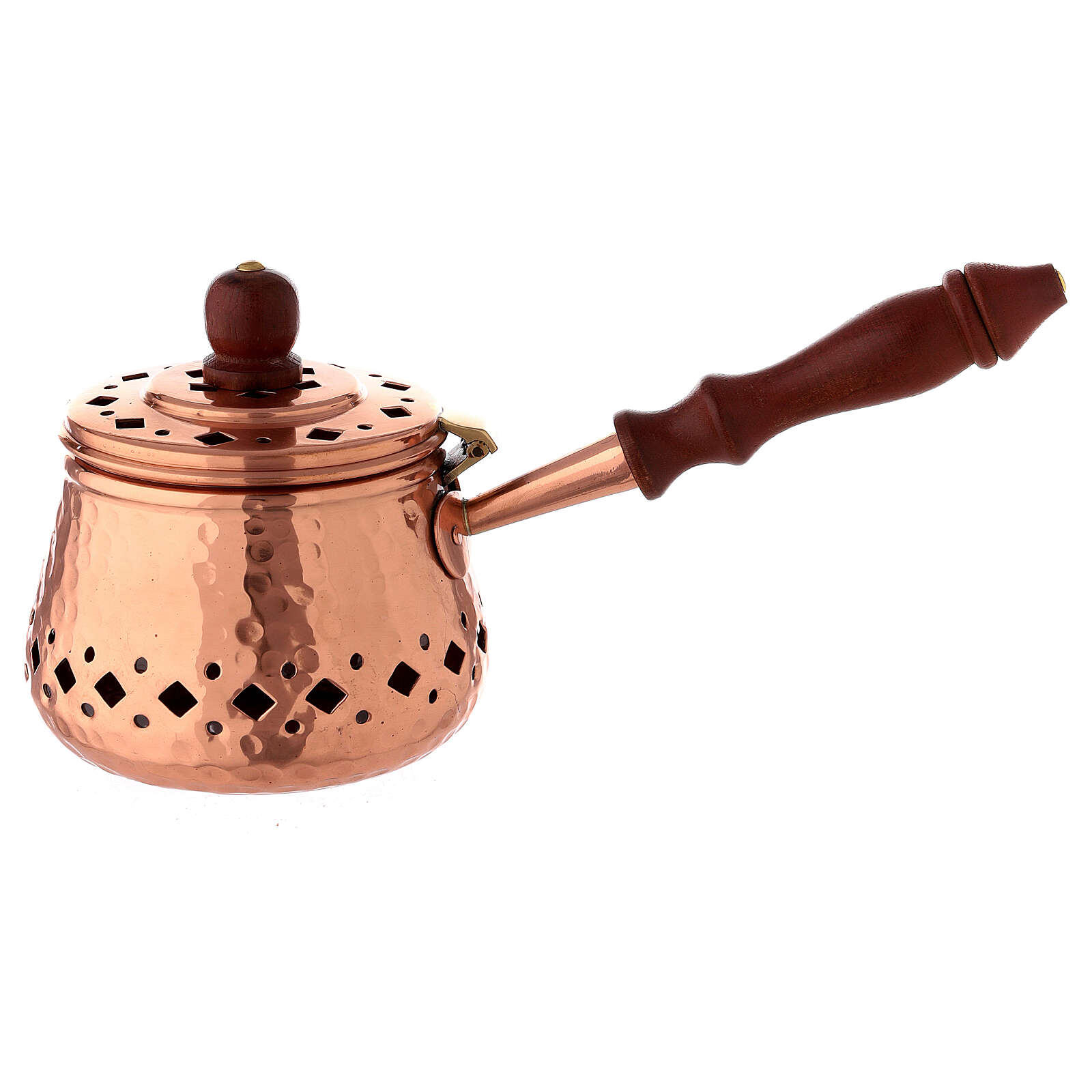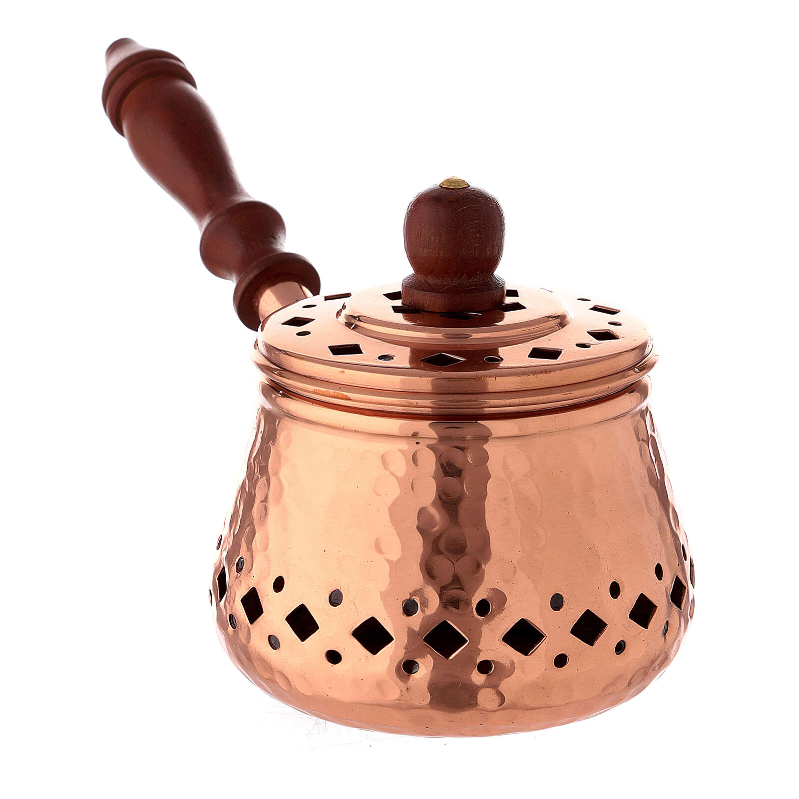 Sartén pequeño para incienso de cobre martillado con agujeros en forma de losanges y círculos pequeños, mango y empuñadura de la tapa de madera pulida.