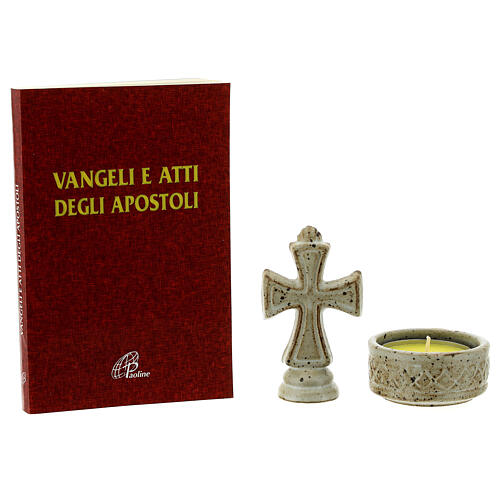 Estuche de oración que contiene una cruz, un portavela con una vela tipo tealight y un libro de bolsillo con los Evangelios y los Hechos de los Apóstoles.
