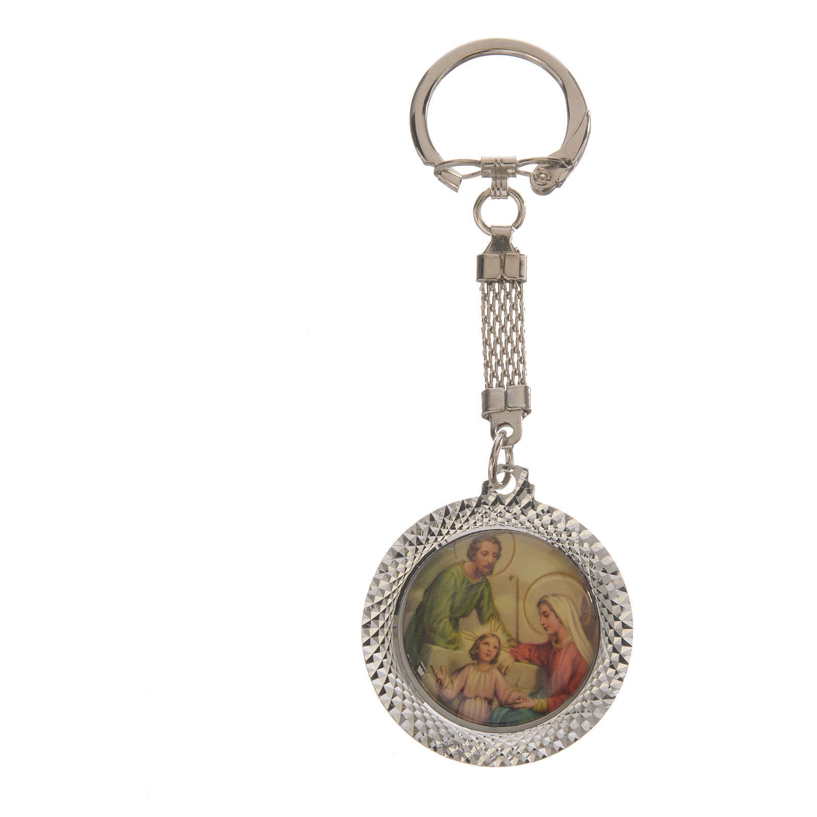 Llavero con medalla de aluminio diamantado de 3,5 cm de diámetro e imagen de resina de la Sagrada Familia.